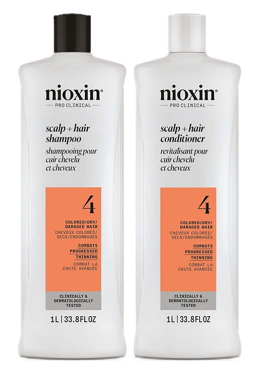 For color treated hair with progressed thinning amplifies hair structure and protects against hair breakage. This unique set of three professional hair products, based on an advanced skin care approach, is specially formulated as a hair thickening treatment, delivering fuller-looking hair and color protection. The Nioxin System 4 regimen reduces hair fall due to breakage, strengthens the hair and delivers a healthy shine to color treated hair, while refreshes the scalp. The Nioxin Cleanser Shampoo removes dirt, excessive oil and other environmental residues from the scalp and hair. Nioxin Scalp Therapy Conditioner is a lightweight conditioner that helps provide hair resilience, hydrates scalp and hair from root to tip.