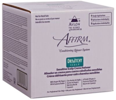 Formula provides maximum scalp comfort. Soothes, moisturizes and controls dry and itchy scalp conditions. Leaves hair silky straight, well conditioned and healthy looking. Adjustable to mild, normal and resistant strengths. Affirm Dry & Itchy Scalp Relaxer System is the first relaxer system designed to reduce dry & itchy scalp conditions and visible dandruff even after initial use. 9-Pack kit contents: 1 x Protecto 2 oz./60 ml., 9 x Creme Relaxer (sealed) 4.9 oz./140 gr., 1 x Liquid Activator 12.75 oz./380 ml., 1 x Measuring Bottle, 1 x Spatula.